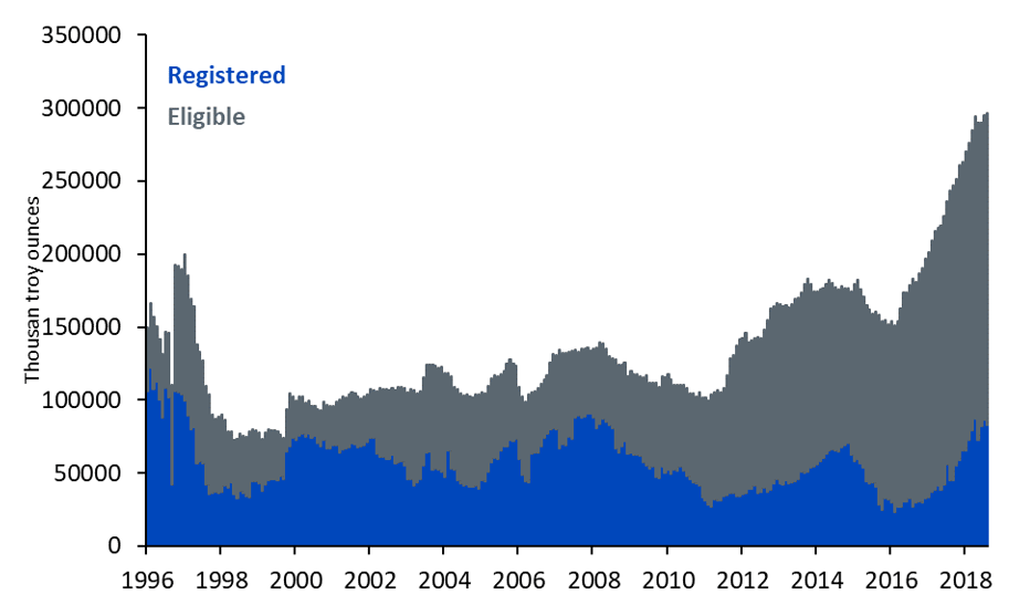 Although most of the gains in silver inventory are in the form of eligible (i.e. meets exchange’s requirements but has not been pledged as collateral against a futures market transaction) as opposed to registered (i.e. meets requirements and has been pledged as collateral for futures market transactions), both have been rising. The trends indicate that there is ample metal availability.