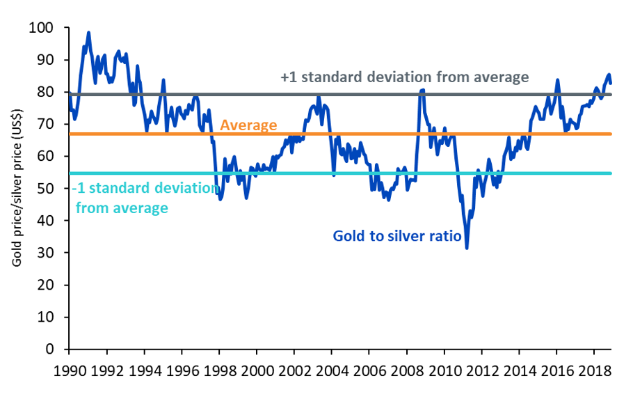 The gold-to-silver ratio points to silver being cheap relative to gold, with the ratio over 1 standard deviation above its historic norm. However, with recent gains in silver, that gap is moderating. We believe that gold is likely to outshine silver as a pure defensive asset that does not have the same exposure to the industrial cycle.