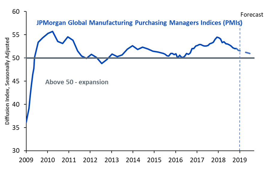 Global manufacturing Purchasing Managers Indices (PMIs) peaked in early 2018. We expect PMIs to continue to decline in 2019, although avoid falling below the 50 demarcation between expansion and contraction. However, deceleration in manufacturing activity is likely to slow demand for silver.