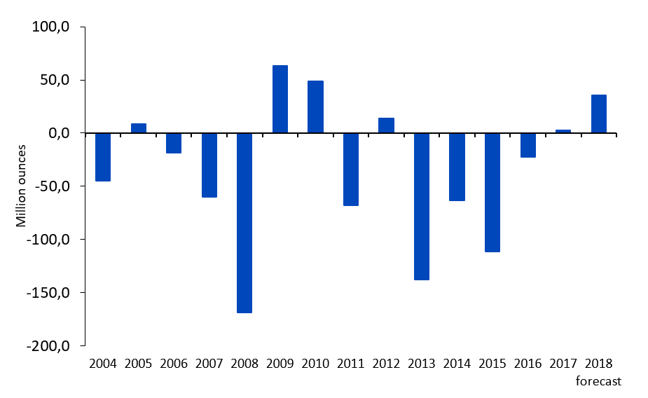 Source: GFMS Thomson Reuters, Silver Institute, WisdomTree, data available as of close 31 December 2018. Forecasts are not an indicator of future performance and any investments are subject to risks and uncertainties.