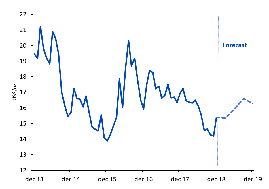 Alongside gold, silver has staged a rally late in 2018, gaining just over 10% in the month of December 2018. Silver’s close correlation with gold (around 80%) helps explain the sharp movement. As we discussed in Gold Outlook 2019, volatility in cyclical asset markets helped defensive assets like gold as investors sought refuge in a safe haven asset. We expect silver to rise to US$16.6/oz by Q3 2019, before easing to US$16.3/oz at the end of the year from US$15.7/oz at the time of writing (07/01/2019). Silver’s gain is likely to be less impressive than gold because manufacturing activity is slowing, and mining activity is likely to start increasing the supply of silver.