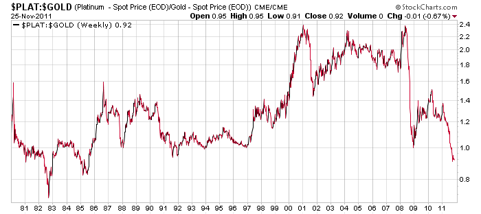 Först av allt, låt oss titta på platinapriset relativt silver och guld ur ett historiskt perspektiv. Genom att använda platinapriset i förhållande till de övriga ädelmetallerna kan vi se hur de andra metallerna handlas relativt varandra både nu och historiskt. I dag är ration platina/guld lägre än 1,0 vilket indikerar att platinapriset är lägre än guldpriset, något som är tämligen sällsynt. Det normala är att platinapriset handlas över priset på guld