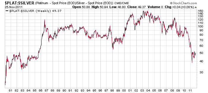 Notera också att platina handlas till låga nivåer jämfört med silverpriset, endast femtio gånger dyrare. Siffran kan förefalla hög, men det är faktiskt ”bara” som är det ordet som gäller. Senaste gången vi såg motsvarande prisrelation, 1:50 mellan silver och platina var 1985. Nivån brukar således vara betydligt högre.