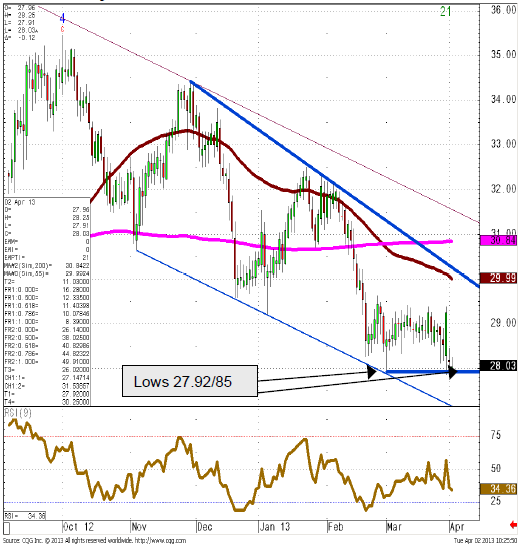 - A close below 27.92 will see the market break down from its recent trading range and put the June 2012 low at 26.11 back on the map this together with the 26.02 2011 represents a major break down point. As stated above, we expect to see more recovery but while silver stays below its January high at 32.51 we will retain a longer term neutral- to-bearish stance.