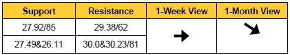 - The late February high at 29.62 will then be eyed before the minor psychological 30.00 level. Further up the area seen between the 55- and 200-day moving averages and the four month resistance line at 30.25 is another potential upside target. This is likely to then lead to a reversal lower being made, however.