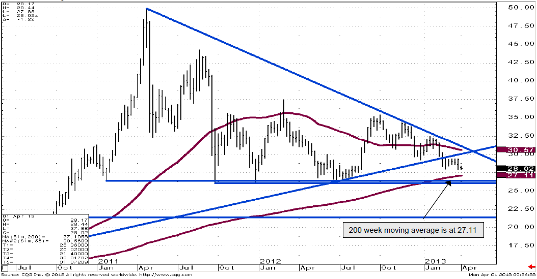 Continues to hover above the 200 week moving average at 27.11