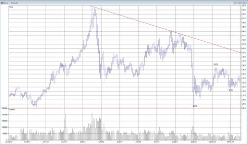 I den senaste analysen av silver den 8 november var priset 34,98 USD/oz och vi såg positiva tecken på lång sikt. Botten från den 26 september på 26,15 var viktig så tillvida att den hållit silverpriset uppe längre tid än 30 dagar. Vi hade också ett viktigt stöd vid 32,10-32,50 USD/oz att bevaka, då ett genombrott av detta område kunde innebära att den förväntade uppgången flyttas fram i tid.