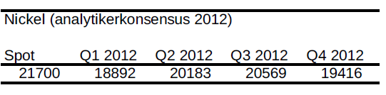 - Mängden utvunnet nickel förväntas stiga med närmare 10% under 2012.