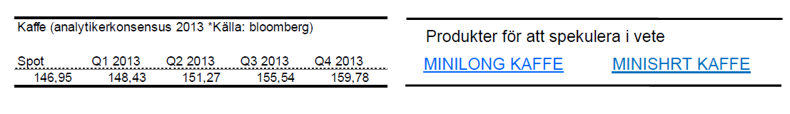 - Kaffe kan mycket väl utvecklas positivt framöver till följd av låg produktion ibland annat Guatemala. Plantorna har i dessa regioner angripits av mögel vilket dämpar tillgången.