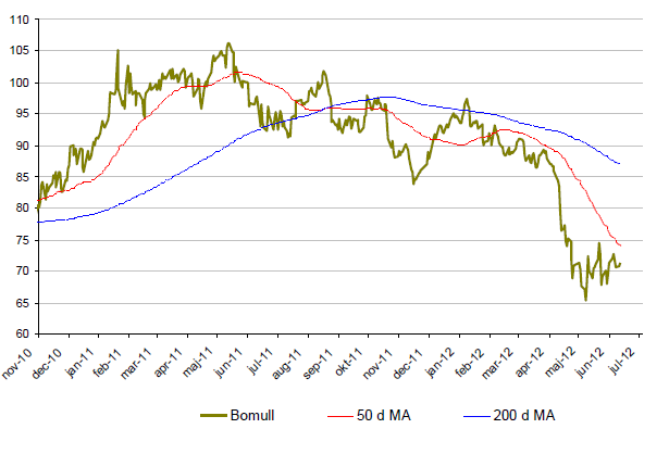 - Trots att bomullspriset fallit kraftigt under 2012 är det fortfarande nästan dubbelt så högt som priset för några år sedan. Fallhöjden är således stor.