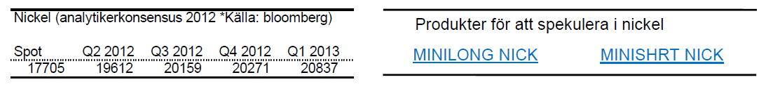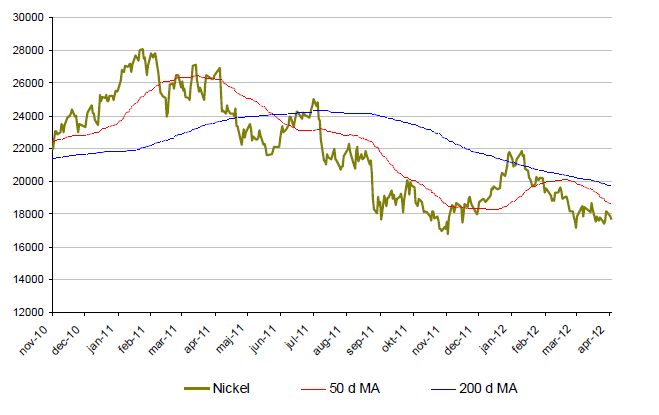 - Nickel fortsätter sin kräftgång under 2012. Efter en uppgång i januari tappade nickel närmare 18 % under februari och mars och är nu den enda basmetallen som inte utvecklats positivt under 2012.