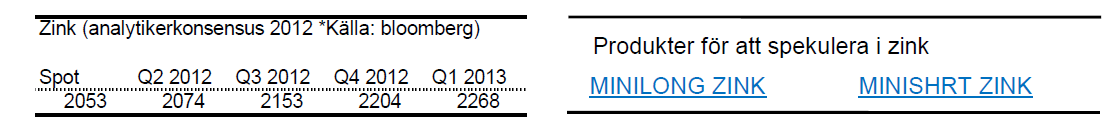 - Likt koppar har zinkpriset kraftigt stigit under den första månaden av 2012. Zink är upp ca 11 % för året.