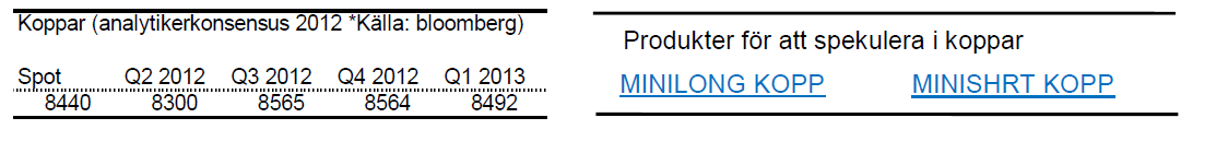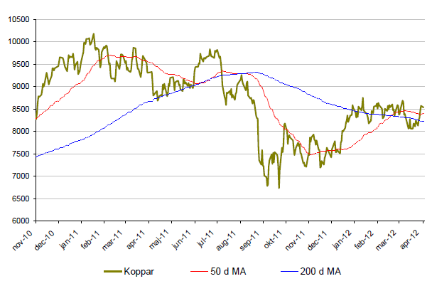 - Koppar har börjat året starkt efter ett ur svagt 2011. Koppar har gått upp ca 12,5% i år. (Att jämföra med -21 % under 2011)