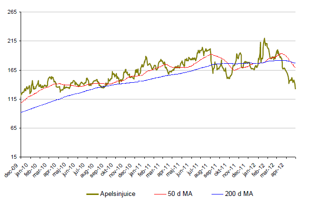 - Priset på apelsinjuice fortsätter att falla som en sten.