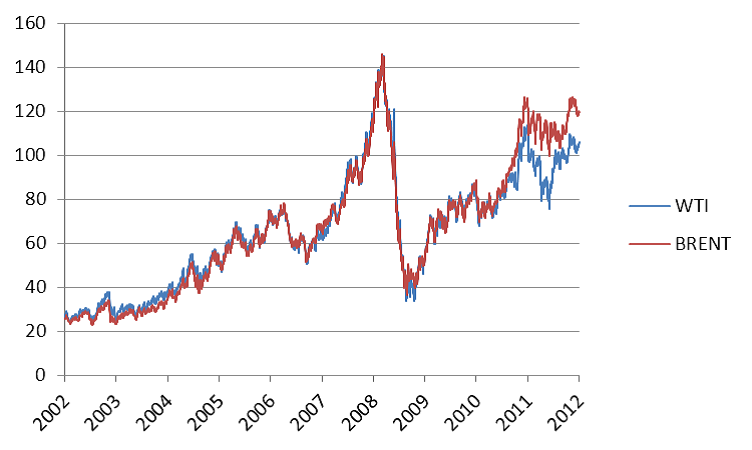 WTI-oljan har historiskt sett handlats runt $2 dyrare än Brent. Det senaste tidens oroligheter i mellanöstern och ökade lagerstatistik i USA har dock resulterat i att Brent-oljan kostat så mycket som $25 dollar mer än WTI.