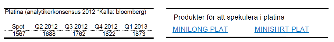 - Platinatillgången spås öka med 3 % under 2012 samtidigt som konsumtionen endast väntas öka med 2 %. Detta gör att skillnaden mellan tillgång och efterfrågan väntas öka med ca 12 %.
