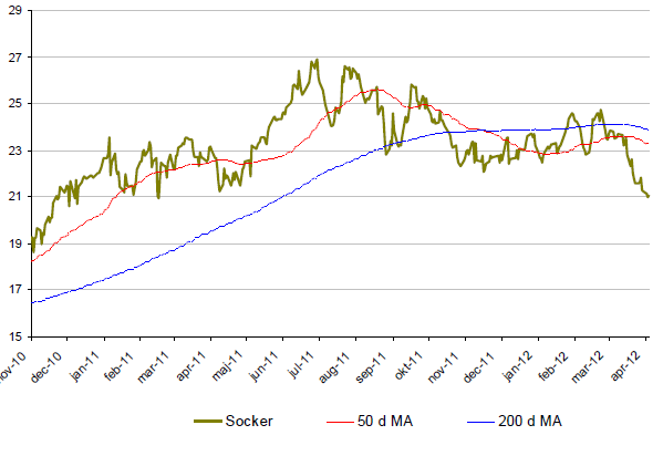 - Sedan mars faller dock socker kraftigt. Indien producerar och exporterar socker i hög fart vilket resulterat i att socker under mars-april tappat nästan 16 %.