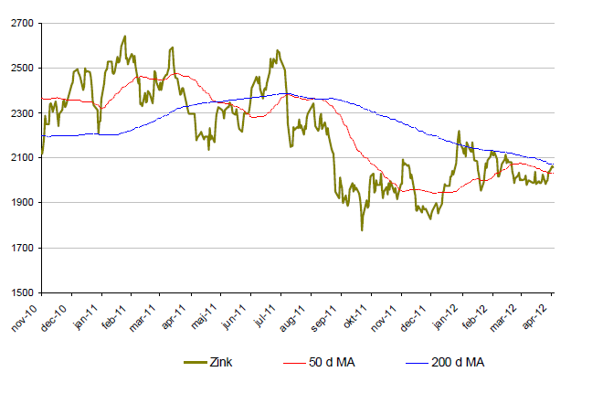 - Zinkprisets har trots en mer sund balans i tillgång och efterfrågan gått upp ca 1,5 % under april månad.