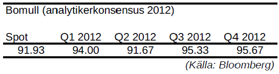 - Trots extrem torka i USA har goda skördar i Kina och Indien täckt upp detta bortfall. Skördarna i Kina anses dock bli mindre varför Kina kan vara tvungna att importera bomull. Något som skulle kunna driva bomullspriset över 100$/lb.