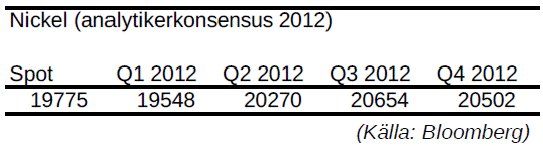 - Mängden utvunnet nickel förväntas stiga med närmare 10% under 2012.