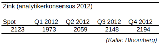 - Den årliga konsumtionen av zink förväntas växa med 3.6% samtidigt som tillgången bara förväntas växa med 3%. Det uppskattas dock att nuvarande zinktillgång skulle räcka 7,5 veckor, 0,5 veckor längre än 2011.