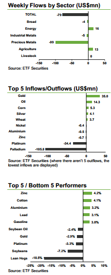 Profit taking drives flows out of platinum group metal (PGM) ETPs. With year-to-date gains of 22.5% and 4.6% for palladium and platinum, respectively, many investors feel like the best of the rally is over. Although platinum fell 3.3% last week, reports of mine closures in Zimbabwe and rising Chinese imports toward the end of the week, could reverse the downtrend. We believe that platinum will rise faster than palladium in coming months, allowing the metal to narrow the recent underperformance. US$105.8mn and US$34.3mn flowed out of ETFS Physical Palladium (PHPD) and ETFS Physical Platinum (PHPT), respectively.