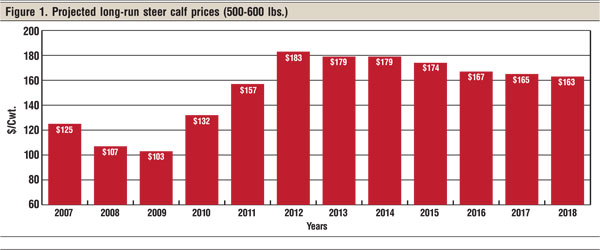 Figur 1 visar de prognostiserade priserna för ungnöt på råvarubörsen i Chicago. Priset på kalvar beräknas nå sin topp under 2013 och 2014, för att därefter minska något fram till och med 2018. Trenden visar emellertid att avkastningen de kommande sju åren kommer att bli rekordhög.