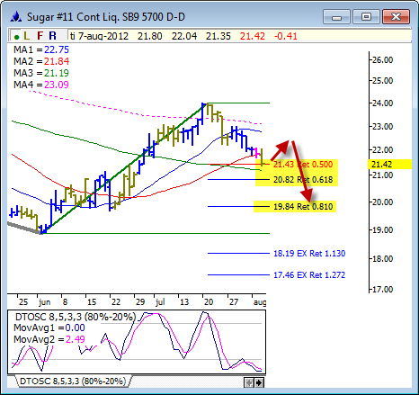 Slutsats: Socker är i en fallande trend men är i en position där vi snart kommer att se att det blir en rekyl uppåt. Vi skall agera med trenden och det är att vara säljare efter att vi har sett en uppgång.
