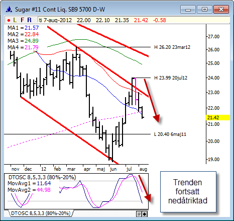 Slutsats: Socker är i en fallande trend men är i en position där vi snart kommer att se att det blir en rekyl uppåt. Vi skall agera med trenden och det är att vara säljare efter att vi har sett en uppgång.