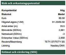 Tethys Oil värderas ett ett p/e-tal på 6 på vinstprognosen för 2015, men det är inget bra värderingsmått för oljebolag eftersom produktionen minskar reserverna och därigenom substansen. ”Vår indikativa beräkning pekar dock på att dagens kurs bara diskonterar de mest uppenbara värdena i bolaget och inget mer”, skriver EP Access.