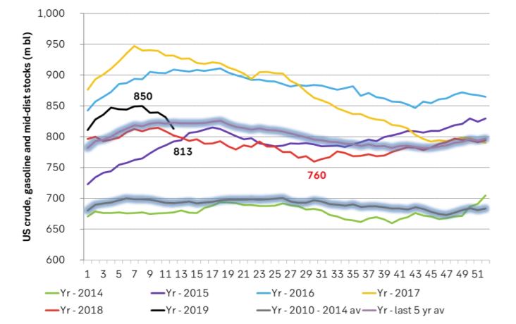 Venezuela is deteriorating rapidly with latest news that due to a blackout its main port is now closed (accounts for about 90% of exports). The country exported 1.7 m bl/d of crude in early 2017 which declined to 1.25 m bl/d in 2018 but now rapidly seems to head to zero.