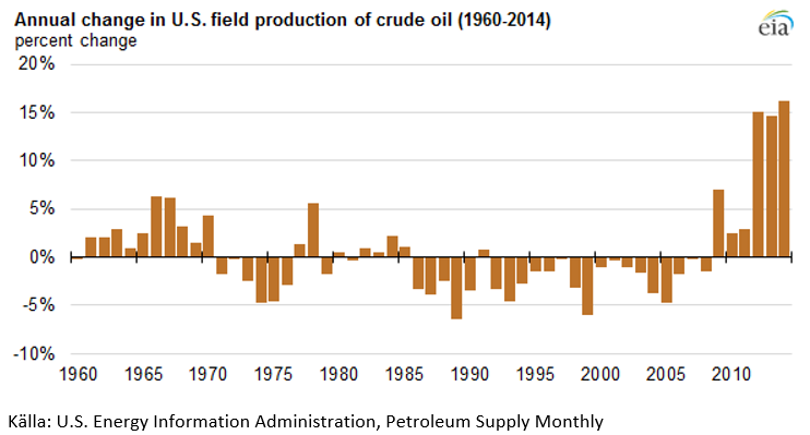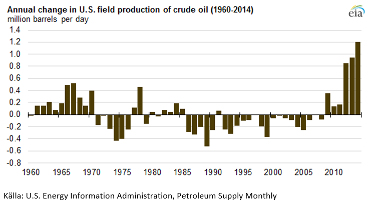 Under 2014 ökade produktionen av råolja i USA med 1,2 miljoner fat per dag, till en total produktion om 8,7 fat per dag. Detta är den största volymökningen sedan de amerikanska myndigheterna började samla in data om oljeproduktionen år 1900. Procentuellt sett motsvarar detta en produktionsökning om 16,2 procent, den högst nivån sedan 1940. Merparten av produktionstillväxten under 2014 kommer från fyndigheter i North Dakota, Texas och New Mexico, där hydraulisk frackning och horisontell borrning används för att producera olja från skifferformationer.