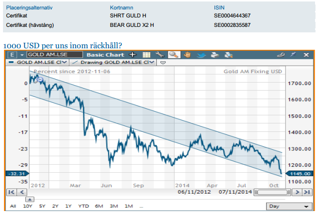 Vi tolkar prisrörelserna de senaste veckorna som att en ny säljvåg har satts i rörelse. Vi handlar nu på 1150 USD per uns, och ligger därmed på fyraårslägsta, och vi ligger farligt nära 1000 USD nivån. En så pass stor nivå kan börja agera magnet för priset, och det var en viktig nivå när vi bröt den på vägen upp under finanskrisen.