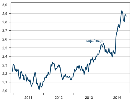 Priset på sojabönor handlas för närvarande på 9,06 USD och majs handlas på 3,24 USD. Om man ställer dessa råvarupriser i relation till varandra handlas sojabönor på en nivå kring 2,8 gånger priset av majs – genomsnittet för de senaste fem åren är 2,4. Det innebär att ”gapet” mellan dessa två råvaror för närvarande är historiskt stort.