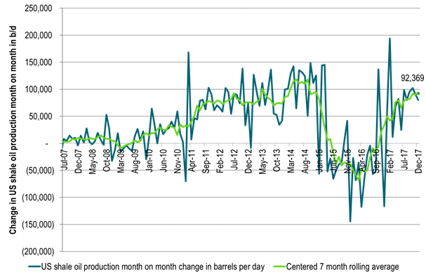 Ch1: US shale oil production growth is exiting 2017 at a rate of about 90 kb/d/mth (1.1 mb/d on a marginal annualized rate)