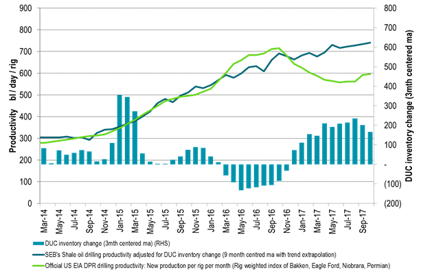 We think that one of the key reasons for why the US EIA has a too low production growth target for 2018 is due to the build-up in the DUC (Drilled but uncompleted wells) inventory which gives an impression of declining shale oil volume productivity. This decline in volume productivity is in our view not real. In our calculations we see US shale oil volume drilling productivity has continued to tick higher even though now mostly sideways. But at least we do not see productivity in decline as the official headline numbers indicate.