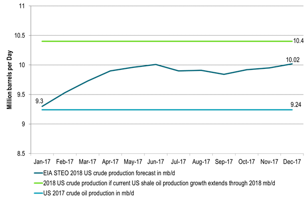 Ch2: If US shale oil production grows in 2018 as it exits 2017 (~90 kb/d/mth) then total US crude production will grow by 1.1 mb/d y/y to 10.4 mb/d y/y