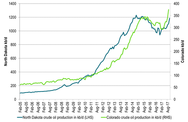 If we extrapolate the current shale oil production growth rate through 2018 it would lead US crude oil production to exit 2018 at 11 mb/d versus EIA’s forecast of 10.34 mb/d. If we include NGLs, Bio-fuels and refinery gains it would lift total US liquids production to close to 18 mb/d in December 2018 and drive total US liquids production growth to 1.7 mb/d y/y Dec-17 to Dec-18.