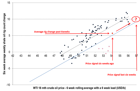 Chart 6: Price signal has pointed higher. Now rig count has started to pick up in response. +5.7 rigs/week ytd.