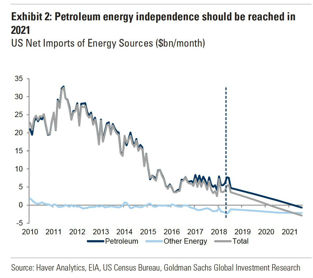 Goldman Sachs förväntar sig att USA kommer att bli energioberoende redan 2019, sett ur ett brett perspektiv. År 2021 kommer landet sedan även att bli energioberoende vad gäller petroleumbaserad energi. USAs nettoimport av energi har fallit både kraftigt och stadigt för att 2017 nå den lägsta nivån sedan 1970-talet, en nedgång med 95 % från toppen år 2008.
