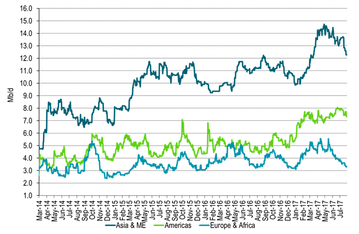 Continued inventory draws last week underpinned the crude oil price rally and the flattening of the forward crude curves. Weekly inventory data last week saw draws of 16 mb of which 10 mb were in the US while a reduction of 8.6 mb in floating storage also took a solid bite. Over the past 5 weeks inventories have drawn down some 70 mb in weekly data. Thus inventory draws kicked in and accelerated almost on the clock as we entered stronger seasonal consumption in Q3-17. Since mid-March weekly data indicate an inventory draw of 104 mb of which 76 mb took place in the US while 18 mb were drawn in floating storage. Refineries are rapidly coming back online with increased crude oil consumption as a result. There are still more refineries to come back online both in Asia and LatAm while Europe and Africa are mostly all up and running. We expect continued draws in H2-17.