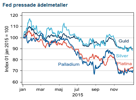 Årets makrotema; Feds första höjning på nio år blev en uttjatad historia som inte infriades förens på årets sista Fedmöte. Då var inprisningen av guld och silver redan gjord och de ädla metallerna som stigit under år av expansiv penningpolitik tappade drygt 10 %.