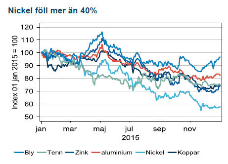 Två av råvaruindustrins starkaste producentkarteller bröt samman under 2014. Mest omskrivet var det faktum att oljekartellen OPEC abdikerade från sin roll som prisgarant. Konsekvensen av detta var att Brentolja föll 48 % och blev årets förlorare, tätt följd av järnmalm som också nära halverades under 2014. Fjolåret, var inte mycket bättre, åter finner vi Brent och järnmalm i botten av listan med -44,5 respektive – 39%. Situationen för våra två största råvaror är slående lika. Lågkostnadsproduktion fortsätter öka (OPEC-olja och Australienmalm) samtidigt som högkostnadsproducenter inte ger vika (skifferolja och kinesisk malmproduktion). Konventionella producenter däremellan sitter med Svarte Petter (Norge och Sverige).