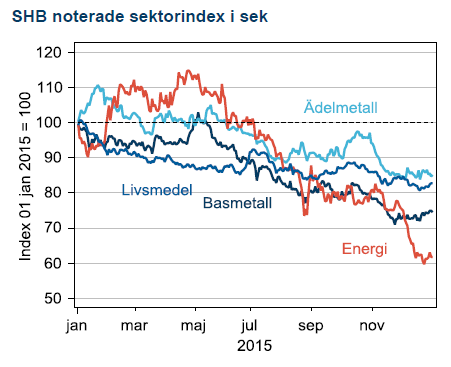 För tredje året i rad slutade samtliga fyra råvarusektorer; livsmedel, energi, basmetaller och ädelmetaller på minus. En förstärkning av USD mot SEK med ytterligare 9,4% efter 2014 års 17,4% hjälpte de SEK-noterade indexen men räckte inte till för positiv avkastning. Årets vinnare var, precis som vanligt, en jordbruksråvara; kakao från Elfenbenskusten och Ghana. Sämsta råvara blev el, som föll 61%, antagligen någon form av rekord.