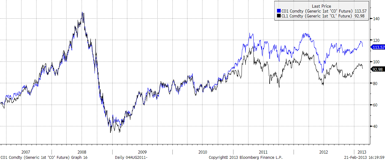 Medan priset på Brent har stigit så ser vi att spreaden Brent-WTI har minskat längre fram i terminskurvan. Under de senaste åren har priserna på WTI och Brent gått isär, med en genomsnittlig rabatt på WTI på 17,47 USD per fat under 2012. I och med att oljelagren i Cushing har minskat som en följd av utbyggnaden av Seaway-ledningen förväntas rabatten på WTI i förhållande till Brent att komma att minska under de kommande månaderna.