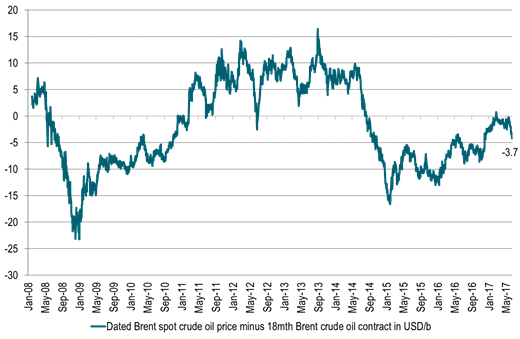 Drawdown in inventories is likely to flatten the forward curve in H2-17. Currently there is a $3/b discount for the 1mth contract versus the 18 mth contract WTI crude. By the end of the year the 1mth contract is likely to trade much closer to the 18 mth contract or even above depending of the magnitude of drawdown.