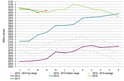 OECD inventories rose 18.6 mb in April marginally up y/y. OPEC has not been able to draw OECD inventories down yet which is a disappointment to the market. Weekly data have shown a substantial draw since mid-March. Some of that draw has been in floating storage and have thus not shown up in the OECD inventories yet.